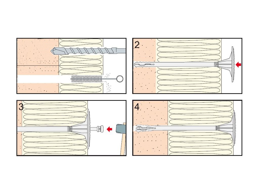 Podklad: armovaný a nearmovaný beton třídy ne nížší než C12/15 podle PN-EN 206-1:2003 kategorie typu A, plná cihla podle EN-771-1:2006 kategorie typu B, silikátová cihla třídy ne nižší než 7,5 podle PN-EN-771-2:2006 kategorie typu B, pórobeton a lehké betony s pevnostní třídou LAC2 až LAC25 podle PN-EN 1520, dutinkový beton podle PN-EN 771-4:2004 Použití: mechanická spojovací součást pro připevňování termoizolačního materiálu s kompaktní strukturou (polystyrén) v technologii BSO, slouží k dodatečnému zpevnění po spojení lepící maltou.